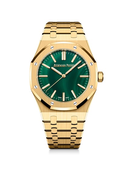 تأتي هذه الساعة بقياس 37 ملم، مع علبة وسوار متكاملين من الذهب الأصفر عيار 18 قيراط، فيما يبرز قرص الملاكيت الطبيعي بتدرجاته الخضراء الغنية التي تضيف عمقاً وطابعاً فريداً على تصميم Royal Oak المميز. تكمل عقارب الساعة المصنوعة من الذهب الأصفر وعلامات الساعات المضيئة المظهر الراقي للساعة، لتضمن وضوح القراءة حتى تحت أضواء المسرح الساطعة.