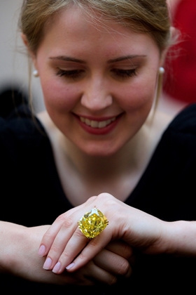 الألماسة الصفراء المتوهّجة 16.3 مليون دولار : لا يمكن غضّ البصر عن هذه الحجرة الضخمة و التي تزن مع الألماسات البيضاء التي حولها 100 قيراط ، فهي تعدّ أكبر حجر ألماس من بين كل الألوان و قطع على شكل وسادة ، بيعت أولاً عن طريق دار Sotheby’s للمزادات في جينيف .
