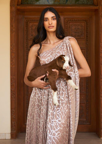 ولذا، استعانت المصممة بالأقمشة الناعمة والراقية بألوان زهرية ومعدنية إلى جانب الأزرق والعنبر. تعد لوحة الألوان التي تتميز بدرجات من اللون الأخضر الأمازون والنيلي والأزرق الطاووس وثيقة الصلة بمزاج الموسم.