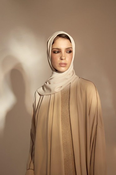 هذه العباية متوفّرة بلونَين حياديَّين، هما البيج الدافئ والأسود، مع طرحة بالون نفسه.