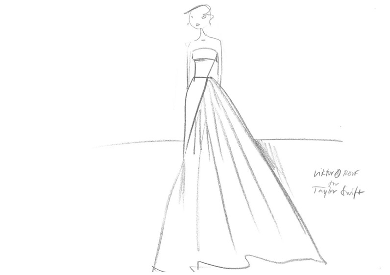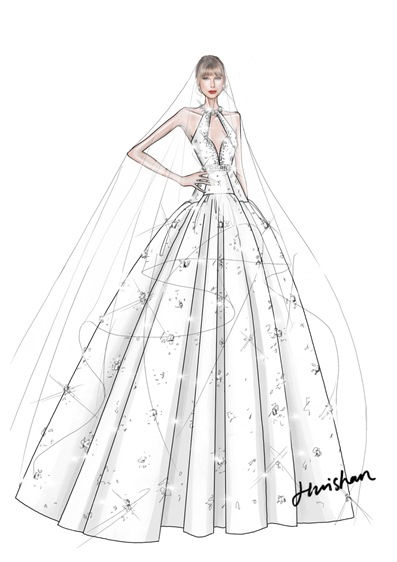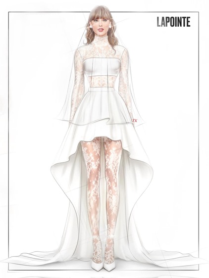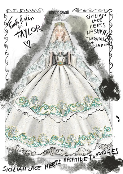 المصمم فاوستو بوليزي، المدير الإبداعي لدار Roberto Cavalli وأحد مَن تعاونوا مع تايلور في إطلالاتها السابقة، تخيّل لها فستان يجمع بين الفن الصقلي وروح الغرب الأمريكي وقال: "تصوّرت فستاناً من دانتيل المكرميه الصقلي المرصّع بأحجار الفيروز والكريستال، يجسّد تلاقح الجذور المتوسطية مع طاقة الموسيقى الأمريكية الرومانسية". في رؤيته، تبدو تايلور كعروس تحمل شغف الحرفة الإيطالية وحرية نجمات الريف الأميركي في آن واحد.