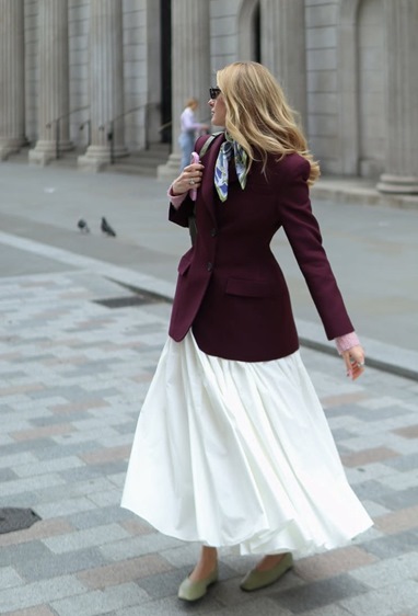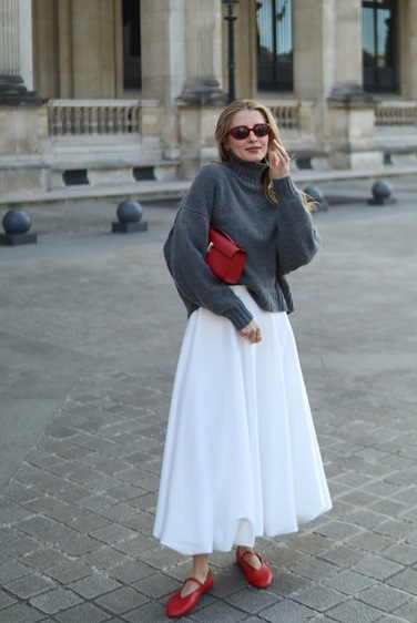 لمن تبحث عن إطلالة أكثر إشراقاً، تقدم فاليريا درساً آخر: لحظة تلاقي الأبيض مع الأحمر قادرة على صنع لوك نابض بالحياة من دون مبالغة. الأبيض يعمل كمساحة فارغة تُبرز جمال الأحمر وتُظهره بنفَس شتوي دافئ، خصوصاً مع معاطف أو أحذية ملوّنة بتدرجات الكرز والعنّابي.