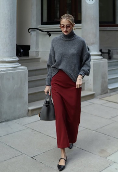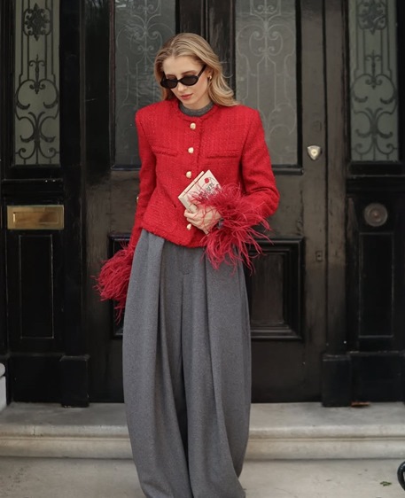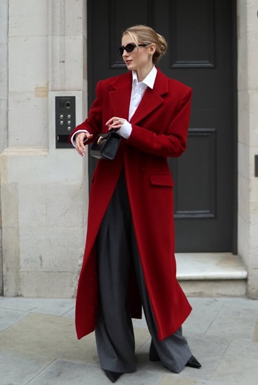 الأحمر عاد بقوة هذا الموسم، لكنه يظهر أجمل حين يُقدّم بطريقة ناضجة. فاليريا تميل إلى دمجه مع الرمادي، فتخفّ حدّته ويصبح أنيقاً وراقياً. قد تبدو الدرجة النارية صعبة، لكن يكفي اعتماد كنزة أو حقيبة حمراء مع بنطال رمادي لتحصلي على توازن جذاب وقابل للارتداء صباحاً ومساءً.