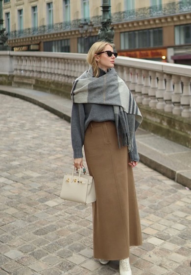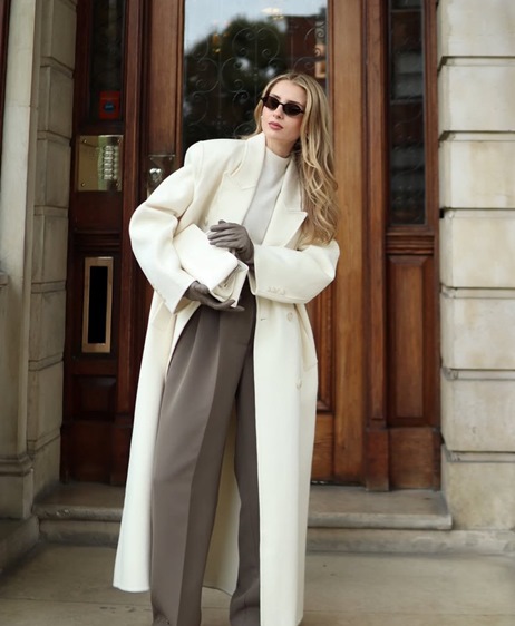 في عالم التنسيق اللوني، هذا الازدواج يعدّ حجر أساس لكل خزانة شتوية. الرمادي يضيف بعداً بارداً، بينما البيج الترابي يضخ الدفء في الإطلالة. النتيجة؟ لوك ناعم، راقٍ، ومناسب لكل مكان، من المكتب إلى عطلة نهاية الأسبوع. فاليريا تتقنه عبر معاطف طويلة وبناطيل واسعة وقمصان محايدة.
