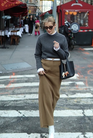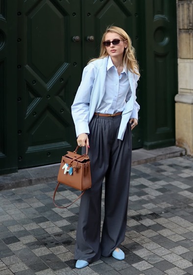 الأزرق الباهت من الألوان التي تمنح الإطلالة تنفّساً وسط ثقل الألوان الشتوية الداكنة. فاليريا تقدّمه مع الرمادي لتمنح اللوك بُعداً بارداً ولكن رقيقاً، أقرب إلى لوحة شتوية هادئة. جرّبيه مع جينز أزرق فاتح وكنزة رمادية، أو مع معطف رمادي طويل وحقيبة بدرجة باودر بلو.