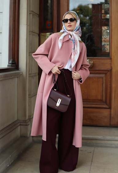 من أجمل ثنائياتها اللونية، التنسيق بين الزهري البودري والرمادي الفاتح. هذا المزج يُظهر الجانب الهادئ من الزهري ويكسر أي طابع طفولي قد يرافقه، خصوصياً حين يُستخدم في معاطف صوفية أو كنزات ناعمة. الرمادي يعمل هنا كقاعدة محايدة تمنح اللوك توازناً مثالياً، ويمكنك اعتماده في إطلالات العمل أو المشاوير اليومية.