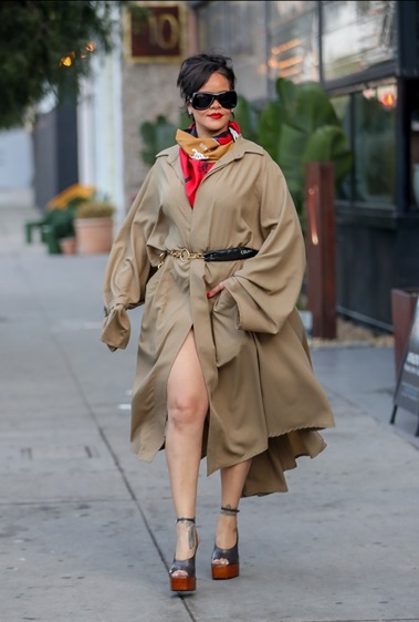 في إطلالتها النهارية، اختارت ريهانا معطف Duster واسعًا من دار Celine بلون جملي دافئ، صُمم بقصّة انسيابية ذات أكمام فضفاضة، وحددته عند الخصر بحزام جلدي أسود من الدار نفسها، تزيّنه سلسلة طويلة ولمسات معدنية ذهبية أضفت بعدًا فاخرًا على الإطلالة. ونسّقت المعطف مع وشاح حريري من Celine، ونظارات شمسية سوداء كبيرة، فيما اختارت حذاءً ذا منصّة سوداء بقاعدة خشبية وكاحل مربوط، من توقيع The Attico ضمن مجموعة ربيع 2026، لتكمل مظهرًا يجمع بين العملية والرقي.