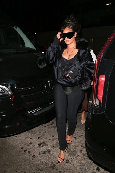ومع حلول المساء، تخلّت ريهانا عن نعومة النهار، واتجهت إلى إطلالة سوداء بالكامل، أكثر حدّة وجرأة. ظهرت النجمة بليغينغ شفاف، وجاكيت ساتان واسع بياقة من الفرو، عزّز الإحساس بالدراما الليلية، فيما عادت النظارات الشمسية الضخمة لتؤكد طابعها الواثق والمتمرّد. أما الحذاء، فكان من توقيع Amina Muaddi، حيث اختارت صندل Iman Satin باللون الأسود، مضيفة لمسة أنثوية حادة إلى الإطلالة.