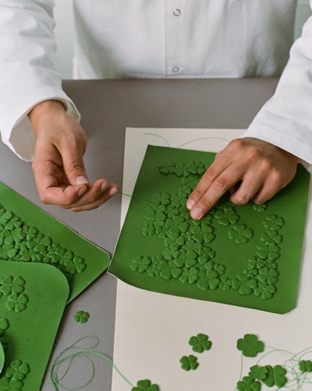 التنفيذ بدوره يحمل الكثير من الحرفية: تبدأ العملية بالختم الحراري للنمط، ثم تُطرّز كل ورقة نفل يدوياً على حدة، في استعراض جميل لدقة مشاغل الدار. حتى أحرف ديور المعدنية تزداد شاعرية مع رمز النفل المصمم بعناية.