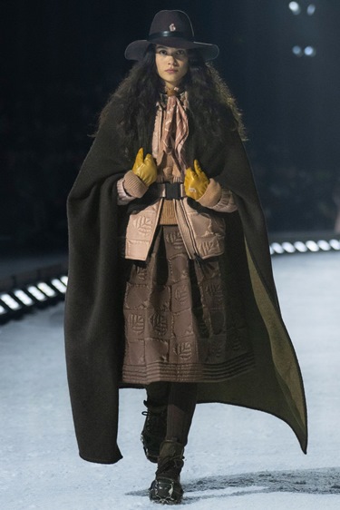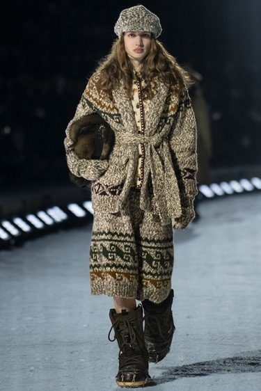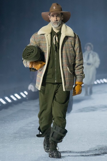 على منحدر مليء بالمطبات الثلجية، ظهرت جيجي حديد تتقدم عدد من العارضين الذين خرجوا كأطياف من قلب الغابة. المشهد بكامله نقل مونكلير غرونوبل من لغتها المستقبلية المعتادة إلى شاعرية أقرب إلى الحكايات المصورة. انتقلت القطع من مفهوم الحماية الوظيفية إلى النشقات التي تبعث فينا الحنين إلى زمن ولّى، عبر خرائط مرسومة يدوياً لمعالم آسبن، وزخارف غربية أعادت تعريف فكرة "الأداء مع التراث".