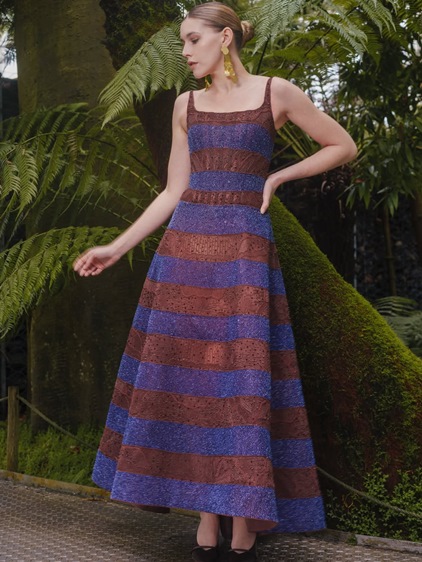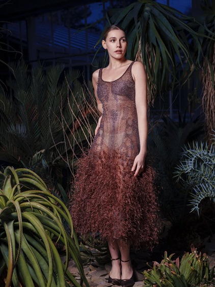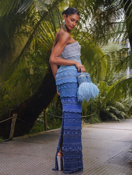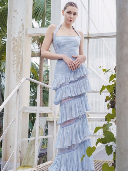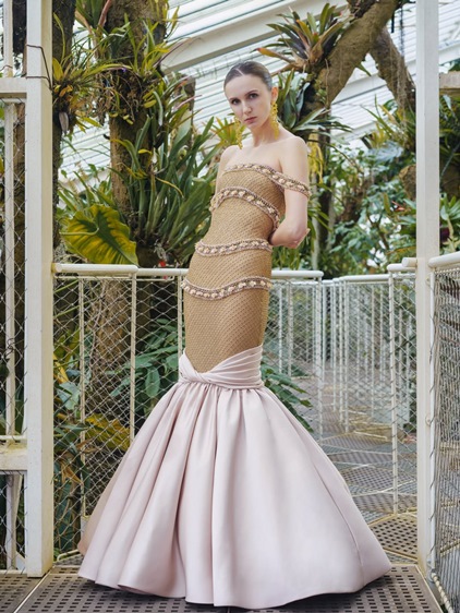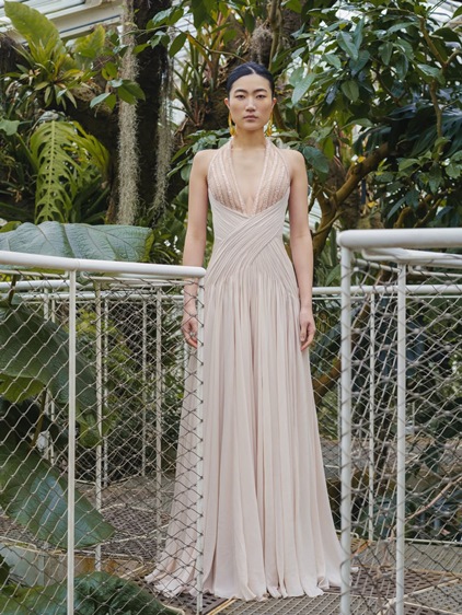 اختيار المصمم حديقة Meise Botanical Garden الزجاجية في بلجيكا لم يكن تفصيلاً ثانوياً، بل امتداد فلسفي للمجموعة. داخل هذا الفضاء المحاط بالزجاج والخضرة، انكشفت ألوان Elementa على ضوء طبيعي مفلتر، ليمنح الدرجات المعدنية الدافئة، الأزرق البارد، النيود الناعم، والأخضر النابض بالحياة عمقاً إضافياً. الضوء هنا لا يضيء الفساتين فقط، بل يكشف طبقاتها، ملمسها، وحركتها النحتية. الأسطح المصممة لتُقرأ كأعمال تجريدية تفاعلت مع المكان، مؤكدة فكرة التحوّل المستمر، وهي فكرة محورية في رؤية قاضي. هكذا، تتحوّل الكوتور من عرض بصري إلى تجربة حسّية، حيث تلتقي الحرفية بالطبيعة، ويتحوّل الفستان إلى مساحة تأمل، تعبّر عن عالم لا يعترف بالحدود الثابتة، تمامًا كما أراده رامي قاضي في Elementa .