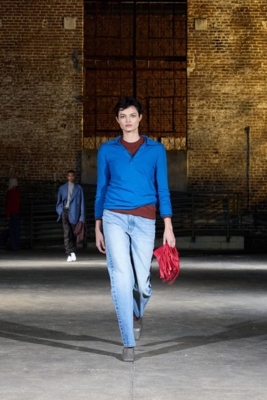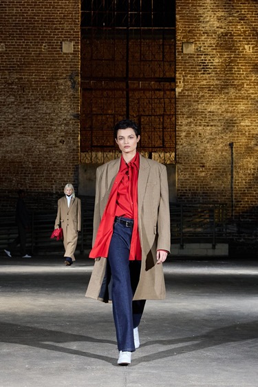 المديرة الإبداعية إيمي سميلوفيتش أعادت التفكير في الجينز بعيداً عن صورته الكاجوال البسيطة. القصّات جاءت مستقيمة ومتحرّرة من أي مبالغة، بخصر متوسط وانسيابية محسوبة تمنح الساق طولاً وأناقة من دون تكلف. لا تمزّقات ولا تفاصيل صاخبة، بل دينم نظيف يعكس نضجاً واضحاً في التعامل مع هذه القطعة اليومية. الجينز في هذا العرض لم يكن قطعة مكمّلة، بل قاعدة يُبنى عليها الللوك بالكامل، وكأنه بديل عملي عن السروال الكلاسيكي في خزانة المرأة العاملة.
