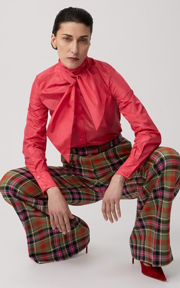 قميص الـBow-tie قد يثير المخاوف من إطلالة تقليدية، لكن النسخة القطنية البسيطة بقصّة نظيفة بعيدة تماماً عن أي طابع محافظ. العقدة الناعمة غير الممتلئة تضيف لسمة أنثوية ذكية، خصوصاً عند تنسيقه تحت Waistcoat أو مع تنورة أو بنطلون عملي للمكتب.