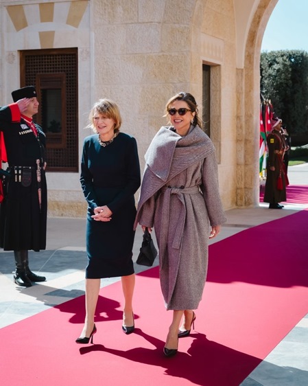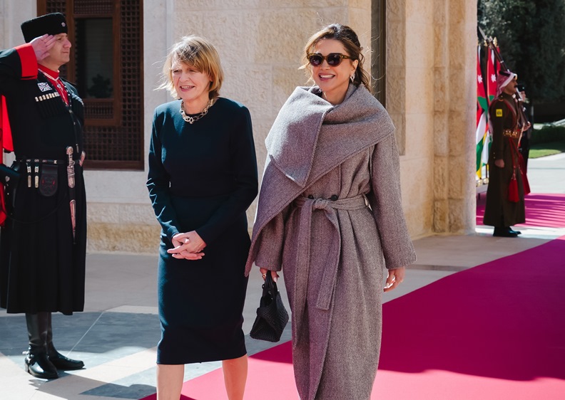 فقد استقبلت الملكة والملك عبدالله أمس، الرئيس الألماني فرانك فالتر شتاينماير والسيدة الأولى إلكه بودنبندر في قصر الحسينية في الأردن، ولهذه المناسبة اختارت الملكة معطفاً واسعاً غير متماثل القصّة باللون الإسبريسو الممزوج بدرجات الرمل من دار Ferragamo، قطعة جديدة اتسمت ببنية هندسية ناعمة وحزام يحدد الخصر بأسلوب أنثوي مدروس. تحت المعطف، نسّقت بلوزة حريرية انسيابية من Victoria Beckham، أضفت خفة على التكوين العام، مع تنورة ميدي بدرجة أوبيرجين غنية من Jason Wu، تميزت بعقدة جانبية منحت الحركة بعداً درامياً راقياً.