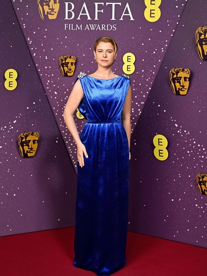 جيسي باكلي قدّمت لحظتها الحاسمة بفستان مخملي أزرق ملكي، مزين ببروشات عند الكتفين وانسيابية ناعمة عند الظهر. الإطلالة بدت احتفالية بكل معنى الكلمة، واستحقت لحظة التتويج.