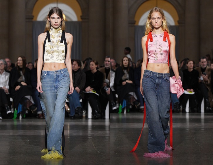 وسط هذا الزخم البصري، برز عنصر غير متوقّع: الدنيم. قطعتان من الجينز الأزرق بقصّة واسعة Baggy وغسل خفيف متدرّج اقتحمتا المنصة بهدوء محسوب. حضور الجينز في قاموس Erdem نادر، ما منح القطعتين قوة مضاعفة. لم يكن الدنيم هنا قطعة يومية اعتيادية، بل عنصر تشويش أنيق داخل خزانة يغلب عليها الطابع التاريخي والزخرفي. القصّة الواسعة أضفت توازناً مع الأحجام العلوية، فيما جاء الغسل الخفيف ليكسر حدّة الرومانسية المعتادة، مقدّماً اقتراحاً عملياً لكن مشبعاً بالهوية.