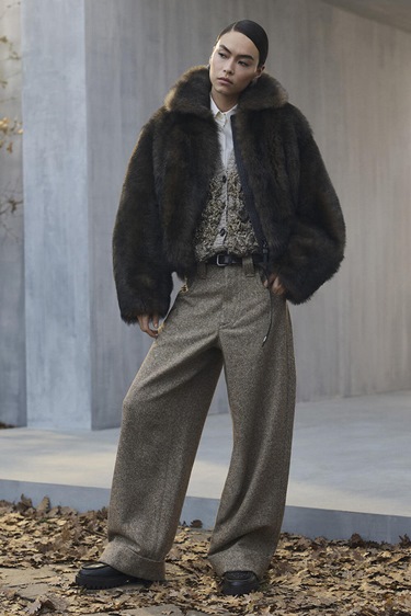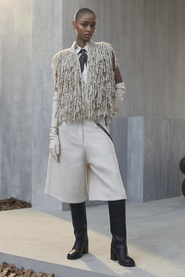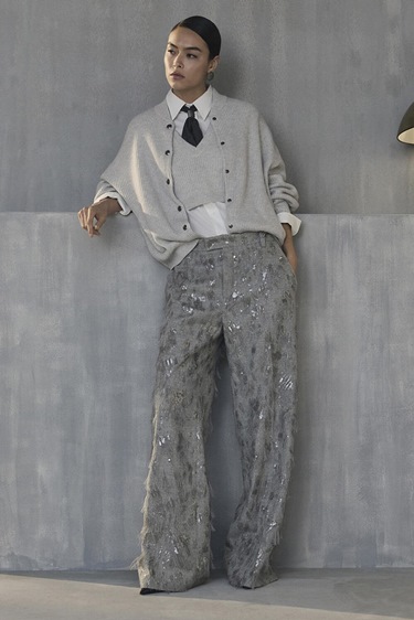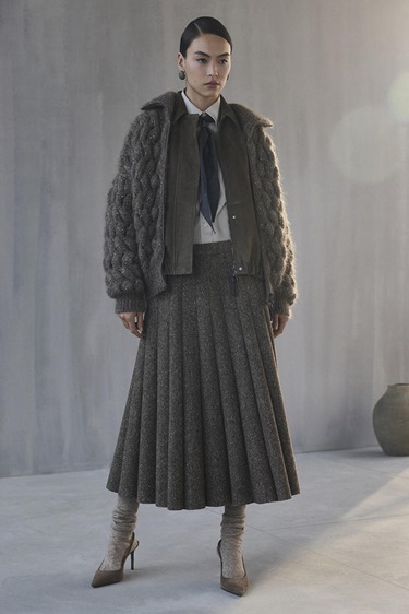 أكواد الدار كانت حاضرة بقوة: الحياكات اليدوية، الحوار المستمر بين الذكوري والأنثوي، والالتزام بالخامات النبيلة. غير أن هذه العناصر لم تُستخدم كإشارات عابرة، بل جرى تضخيمها. وصف كوتشينيلي المجموعة بـ"كوتور ريفي"، وهو تعبير قد يبدو متناقضاً للوهلة الأولى، لكنه تجسّد بوضوح في التفاصيل. معاطف من الموهاير تحاكي الفرو بتموجات ناعمة، أو تتزيّن بخيوط مولينيه ولمسات ترتر خافتة تلتقط الضوء من دون استعراض. الشيرلينغ عولج ليبدو كأنه تريكو أو حتى فرو فاخر، في لعبة ذكية تمحو الحدود بين الريفي والمترف.