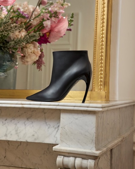 تظهر هذه الفكرة في عدة تصاميم ضمن المجموعة. فالأحذية القصيرة المصنوعة من جلد النابا الأسود تتميز بخطوط نظيفة تمنحها حضوراً قوياً. كما تقدم الدار أحذية Pumps مزينة بعقد معدنية مرصعة بالكريستال، تجمع بين الأناقة والبنية الصارمة في التصميم.