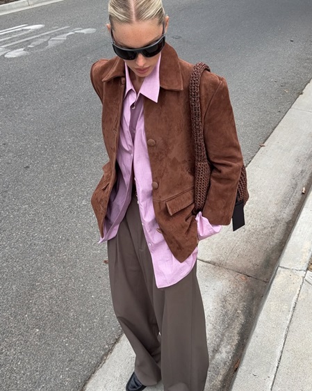 2. للخروجات النهارية: جرّبي مزجه مع سويتر واسع بألوان دافئة مثل العنابي أو البيج، مع حقيبة جلدية كروس أو حقيبة كبيرة. لإطلالة عصرية، يمكن اختيار حذاء سنيكرز أو بوت منخفض بكعب.