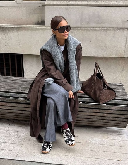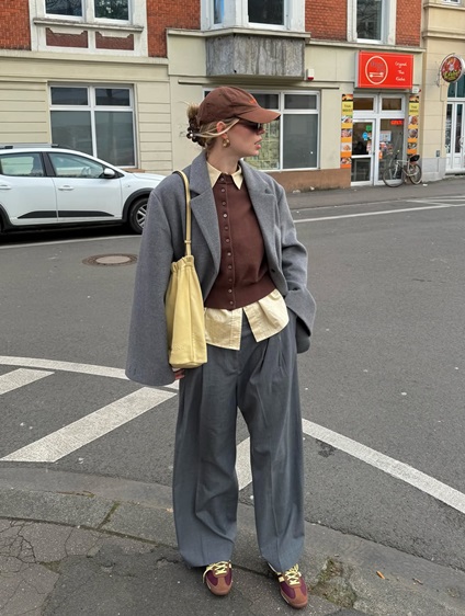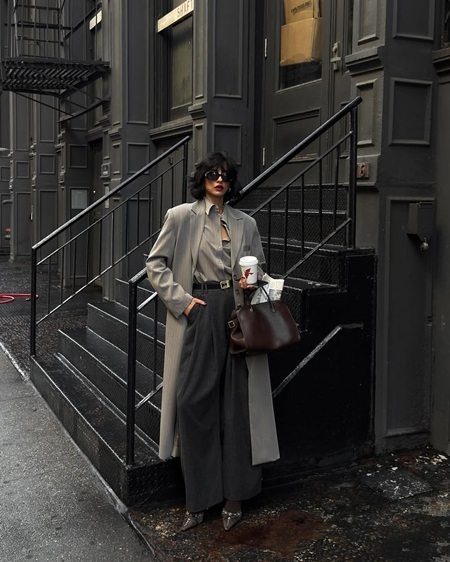 القصّة الواسعة للبنطلون الرمادي تمنحه قدرة على التكيّف مع مختلف أنواع الأجسام، حيث يطيل الساقين ويضيف توازناً للخصر والأرداف. اللون الرمادي أيضاً يشكل قاعدة مثالية لمزيج الألوان الطبقية، سواء كانت ألوان الباستيل الناعمة أو الألوان الداكنة كالأسود والكحلي.