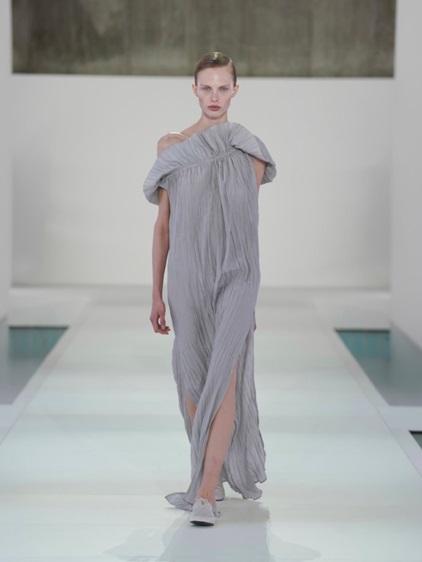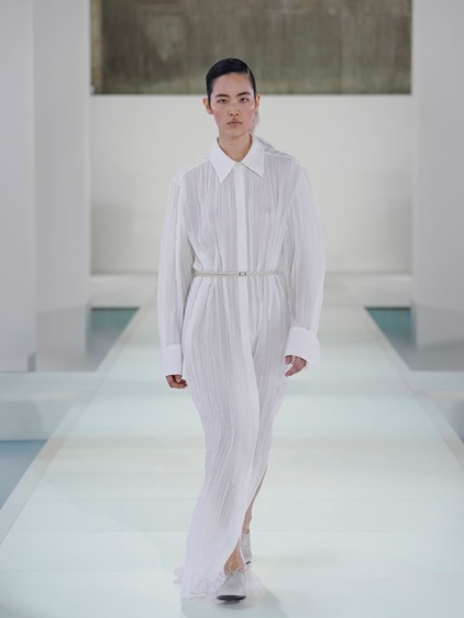 في تشكيلة الأزياء النسائية، تبرز بساطة مستوحاة من ستايل التسعينيات، لتضفي وضوحاً على القصّات، ويخفف من حدة هذه البساطة نسيج التريكو المخطط الرقيق والشفاف الذي يغطي الفساتين والتصاميم المتناسقة، بينما تشير الأكتاف العريضة المخفية إلى الستايل البارز والمُلفت الذي ساد في الثمانينيات. وقد أعيد تصور الخياطة المميزة من خلال الأقمشة الانسيابية والطيات المدروسة، حيث يقدم الدنيم المصنوع من الحرير رؤية عصرية للملابس الرسمية. يظهر الحرير في التشكيلة بعدة أشكال: مطوي بنعومة، مُحدد في فستان مكشوف الكتفين، ومن خلال قميص مميز يوفر الدقة والراحة في آن واحد. يستمر التلاعب بالخامات عبر تصاميم بتفاصيل متجمعة بنعومة، والمنسدلة بانسيابية على الحامل، بينما تخلق الملابس الخارجية الانتقالية – التي أعيد النظر فيها من خلال الأبعاد – تبايناً بين الكلاسيكية والحداثة، والابتكار والفن. تكتمل الإطلالات بأيقونات خزانة الملابس التي أعيد تصورها من خلال عدسة كولكشن أوف ستايل، بما في ذلك أحذية البليمسول الجلدية المرنة، وأحذية ميول بكعب، والحقائب المصنوعة من خامات متناسقة.