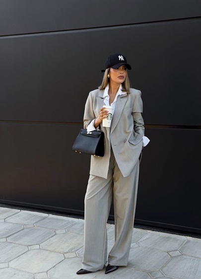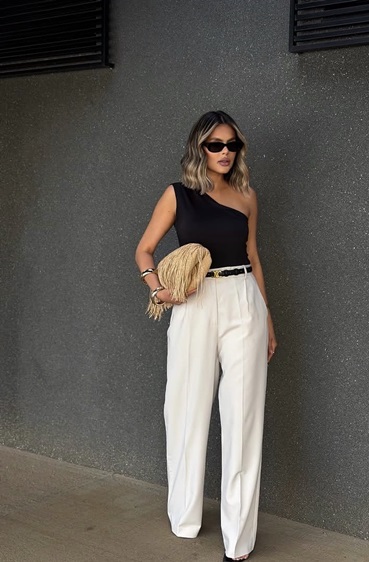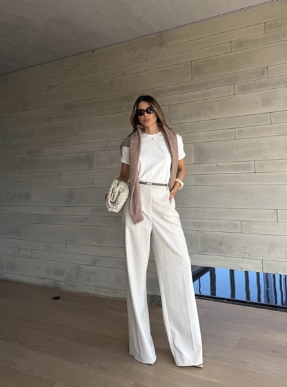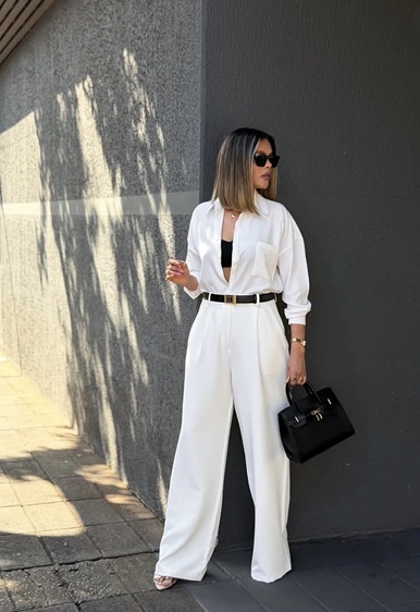 يمكنك أيضاً اعتماد أسلوب الأناقة العصرية، مع تبني البنطلون الأبيض الواسع، والذي عند تنسيقه مع بلايزر أسود وهيكلية واضحة، يتحوّل إلى خيار مثالي لإطلالة قوية ومهنية بلمسة أنثوية. لإتقان هذا الأسلوب، اختاري قصّات نظيفة وخامات فاخرة، ونسّقي مع حذاء بسيط بكعب منخفض. النظارات الشمسية الداكنة وحقيبة هندسية الطابع يضيفان لمسة من الحضور والثقة، ما يجعل الإطلالة مناسبة للاجتماعات أو حتى العشاء المسائي.