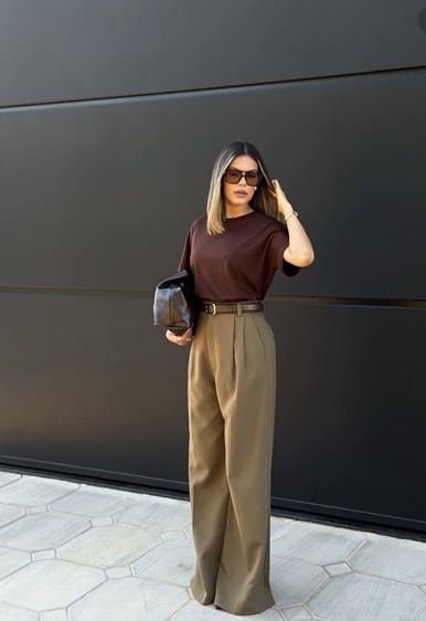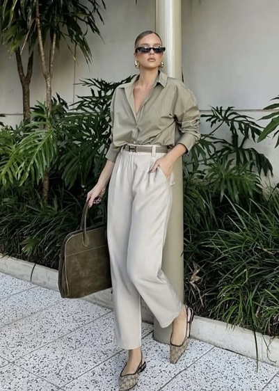 يمكنك أيضاً اعتماد لوك بأسلوب البساطة النظيفة، حيث يتناغم البنطلون البيج الفضفاض مع توب أبيض ضيّق بقصّة عصرية، ما يخلق تبايناً جذاباً بين الحجمين. هذا النوع من التنسيق يبرز القوام بطريقة ذكية دون تكلّف. للحصول على هذه النتيجة، احرصي على اختيار بنطلون بقماش خفيف وانسيابي، مع توب يبرز الجزء العلوي من الجسم. الألوان الحيادية هنا تلعب دور البطولة، لذا يمكنك إضافة حقيبة أو حذاء بلون داكن لكسر الهدوء وإضفاء عمق بصري.