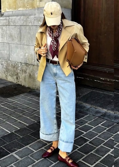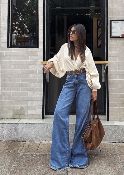 اختاري بلوزة بأكمام واسعة أو تفاصيل منسدلة لإضفاء حركة على الإطلالة، ولا تنسي الحزام العريض الذي يحدّد الخصر ويكسر امتداد الجينز. حقيبة كبيرة من الجلد تضيف بُعداً عملياً وأنيقاً في آن واحد.