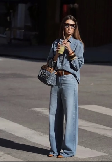 أما فكرة التنسيق الخامسة فتعيد إحياء صيحة "الدنيم على الدنيم"، لكن بروح جديدة. تنسيق بنطلون جينز واسع مع قميص دنيم بنفس الدرجة اللونية يمنحك مظهراً جريئاً لكن متماسكاً. لمنع الإطلالة من أن تبدو تقليدية، اختاري قصّات حديثة مثل الأرجل الواسعة أو القميص بقصّة oversized . الإكسسوارات تلعب دوراً أساسياً هنا: حقيبة جليدة أو أحذية ملوّنة كفيلة برفع مستوى اللوك بالكامل.