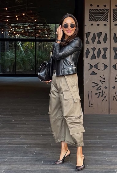الإطلالة الأولى عبارة عن مزيج مثالي بين العملية والأنوثة. البنطلون الواسع بلونه الوردي الترابي ينسجم بسلاسة مع قميص الدنيم، ليخلق تبايناً لونياً ناعماً يليق بأيام الربيع. السر هنا يكمن في اختيار قصّة عالية الخصر، ما يمنح القوام توازناً وانسيابية. لإتقان هذا اللوك، جرّبي إدخال القميص داخل البنطلون جزئياً لإبراز الخصر، وأضيفي إكسسوارات جلدية بلون دافئ مثل البني. قبعة بسيطة أو نظارات شمسية كفيلة بإضفاء طابع حضري أنيق دون مبالغة.
