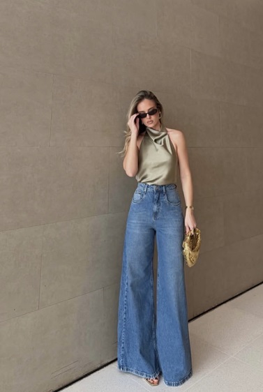في إطلالة ثانية، نلاحظ كيف يتحوّل الجينز الواسع إلى قطعة أنيقة عند تنسيقه مع بلوزة انسيابية بلون حيادي. هذا التباين بين خامة الدنيم القوية والقماش الناعم يخلق إطلالة متوازنة، مثالية للانتقال من النهار إلى المساء.