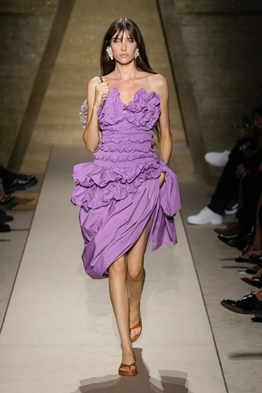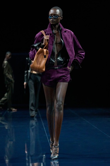 أما لعاشقات الدرجات الغنية، فيأتي البنفسجي الداكن Purple Reign كخيار أنيق ومتعدد الأوجه. لم يقتصر ظهوره على درجة واحدة، بل تنوّع بين البرقوقي والبنفسجي الملكي والتوتي، كما رأيناه في Burberry وTom Ford . بعض المصممين استلهموا من سبعينيات وثمانينيات القرن الماضي، من خلال المعاطف الجلدية والتنانير العملية، فيما قدّمت علامات مثل Tory Burch وPrada هذا اللون بأسلوب أكثر حداثة من خلال قصّات جريئة وتنسيقات غير تقليدية.