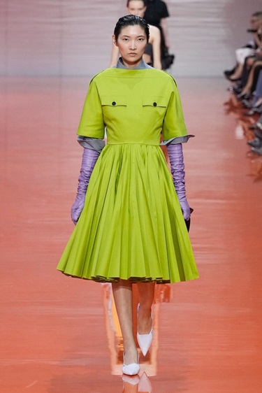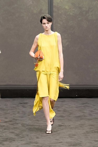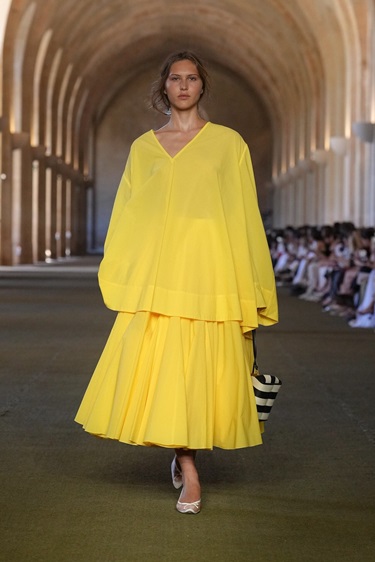 أول هذه الاتجاهات يتمثل في الأصفر الحمضي أو Citrus Yellow، الذي حضر بقوة على منصات Jacquemus وAlaïa وFendi. هذا اللون، الذي تطوّر تدريجياً من الأصفر الزبدي الناعم، بات أكثر إشراقاً وحدّة هذا الموسم. اللافت أنه لم يُحصر في القطع الجريئة فقط، بل تم توظيفه في تصاميم كلاسيكية مثل المعاطف الترنش والتنانير الضيقة، ما يمنحه قابلية أكبر للدخول إلى خزانة المرأة اليومية. إنه لون يعكس مزاجاً متفائلاً ويكسر رتابة الإطلالات الأحادية بسهولة.