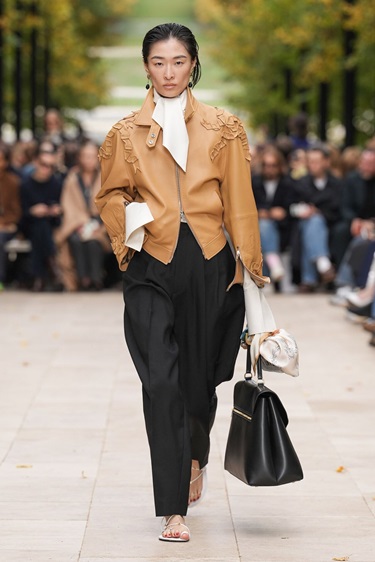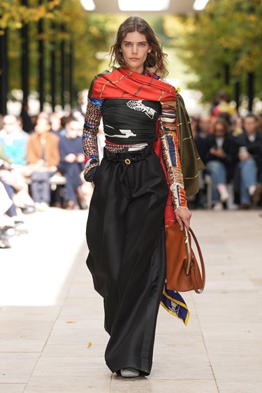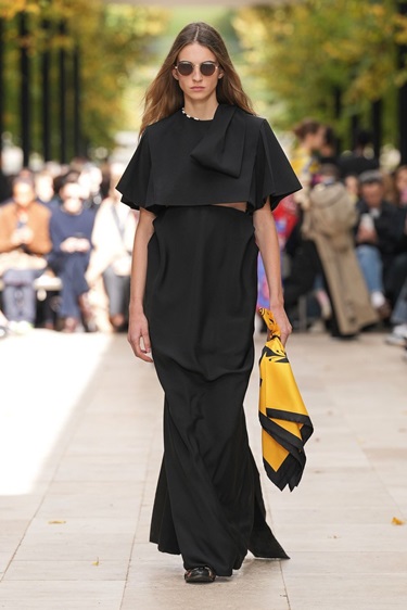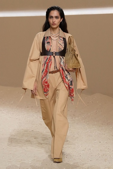 في المجموعة الأولى ثم مجموعة الربيع التي تلتها، ظهر الوشاح الحريري بكل الطرق الممكنة: فقد أطلّ من تحت ياقة المعطف، التفّ حول الرقبة بأسلوب غير رسمي فوق البلايزر، أو انسدل على الكتف مثل وشاح مسائي خفيف. اما الأسلوب الأكثر إثارة، فهو أن الدار استخدمته أيضاً كقطعة أساسية في التصميم نفسه، كقماش داخلي لمعطف ترنش، أو تنورة من قطع متعددة، وحتى كتوب ملفوف بأسلوب أنثوي جريء.