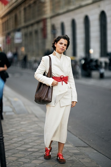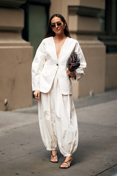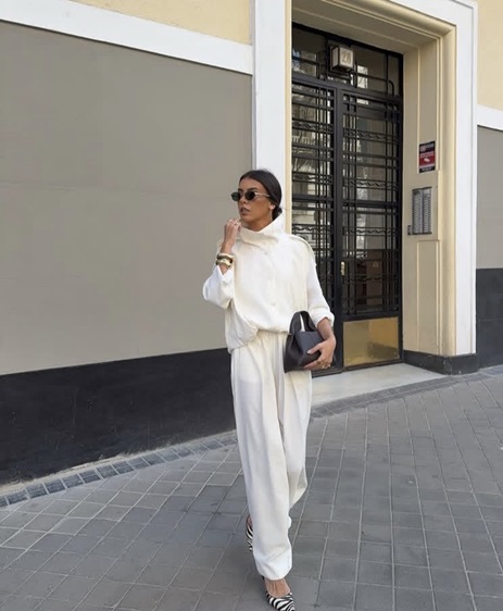 الأطقم البيضاء المتناسقة هي الحل السريع لإطلالة أنيقة. لا تحتاجين إلى التفكير كثيراً، فاللوك جاهز مسبقاً. كل ما عليكِ هو إضافة قطعة لافتة: حذاء مميز أو حقيبة بلون قوي. هذا النوع من الإطلالات يعكس ثقة هادئة، وهي تماماً الروح التي يحملها Cloud Dancer.