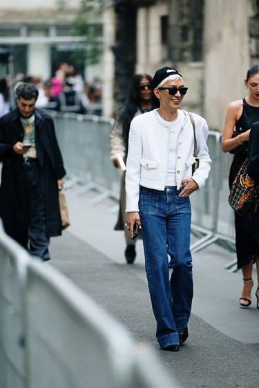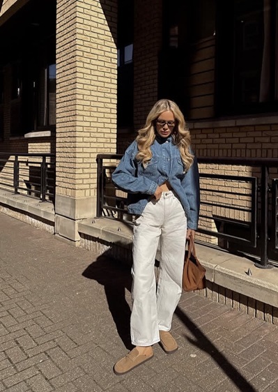 الجينز الأبيض، خصوصاً بقصّة واسعة، هو تعريف الأناقة المريحة. يمكن تنسيقه مع كنزة سوداء ومعطف فرو لإطلالة شتوية دافئة، أو مع قطع رمادية لأسلوب أكثر هدوءاً. التفصيل الأهم هنا هو الحافة عند الكاحل: اتركيها ظاهرة لتبرزي الحذاء، سواء اخترتِ لوفر كلاسيكيا أو بوت مريحا.