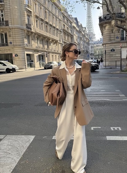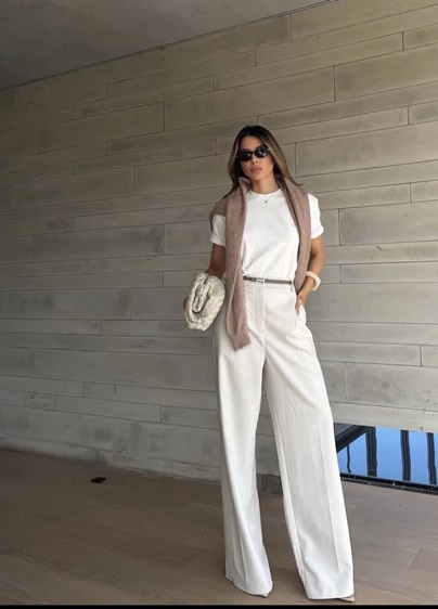 عندما تحتارين، اذهبي إلى الإطلالة الأحادية. الأبيض مع الأبيض يبدو فاخراً بشكل غير متكلّف. بلوزة حريرية مع توب رقبة عالية وبنطلون بنفس الدرجة تمنحك مظهراً ناعماً ومضيئاً. يمكنك كسر هذا الانسجام بإكسسوارات خفيفة: حقيبة بلون أزرق سماوي أو بوت بدرجات البني الدافئ.