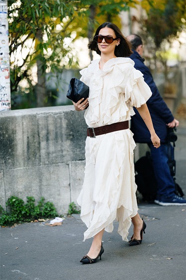 إذا كنتِ تميلين إلى الأسلوب الناعم، فالأبيض هنا يلعب لصالحك. الفساتين المزينة بالكشكش أو المصنوعة من الدانتيل تعود بقوة هذا الموسم، لكن بروح أخف وأكثر عصرية. فستان أبيض مزيّن بالكشكش مع أكسسوارات متناغمة يمنحك حضوراً أنثوياً من دون مبالغة. أما الدانتيل، فجرّبيه بطريقة أكثر جرأة: جاكيت ضيق مع شورت قصير وبوت عال يصل إلى الركبة. مزيج بين الرومانسية والتمرد.