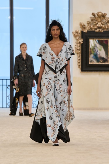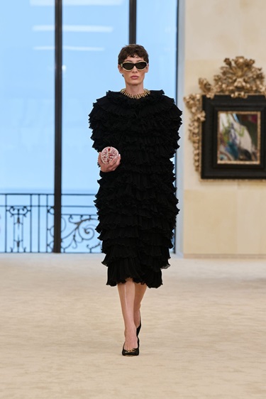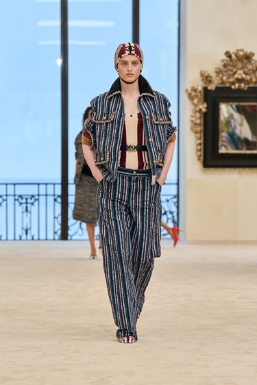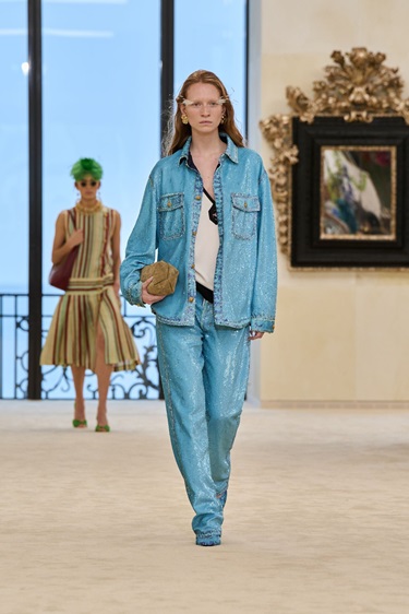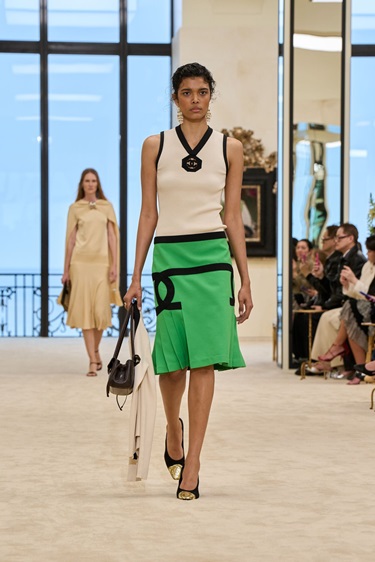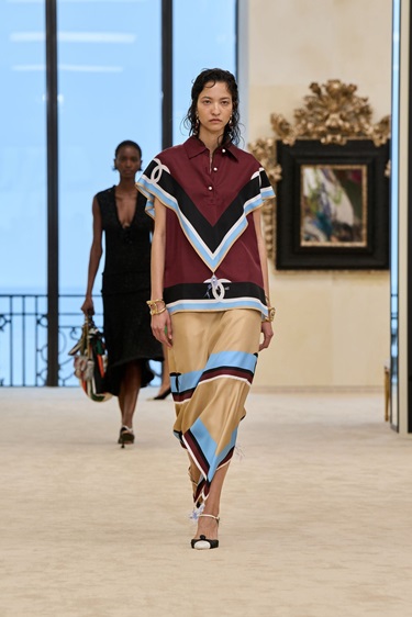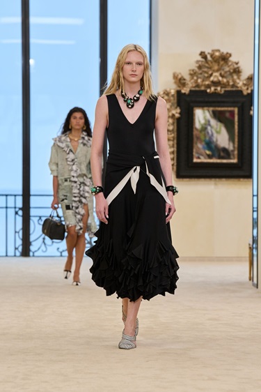 القصّات بدورها حملت هذا التوازن بين الأرشيف والتجديد. الفساتين الملتفّة والتنانير منخفضة الخصر عادت بروح عشرينيات القرن الماضي، لكن بتصميم يناسب إيقاع اليوم. السترات جاءت واسعة وخفيفة، مصممة لحركة ديناميكية، بينما أضفت التفاصيل مثل الخصر “الملفوف” إحساساً عفوياً، وكأن القطعة ارتُديت دون جهد، تماماً كما تفعل امرأة تقضي يوماً على الشاطئ.