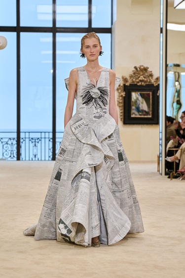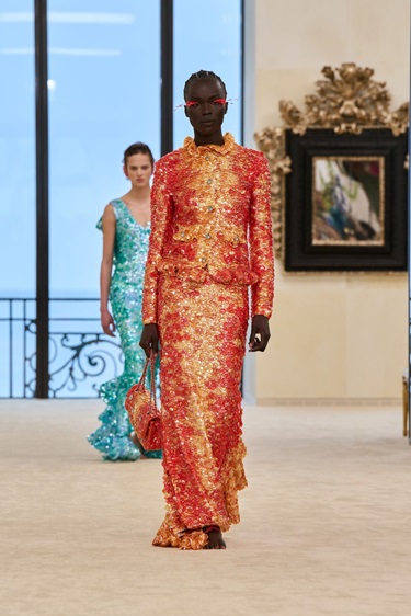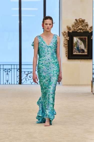 السرد لم يكن خطياً، بل تطوّر كرحلة بصرية تبدأ من امرأة المدينة الأنيقة وتنتهي بحورية البحر الحالمة. هذا التحوّل تجسّد في الأقمشة والانسيابية، حيث ظهرت فساتين شبكبية مستوحاة من أدوات الصيادين، لكنها مرصعة بكريستالات تشبه قطرات الندى البحري، ومطعّمة باللؤلؤ بأسلوب يرفعها إلى مستوى الكوتور. هنا تحديداً، أثبت بلازي قدرته على إعادة تعريف المواد اليومية وتحويلها إلى عناصر فاخرة تحمل طابعاً شعرياً.