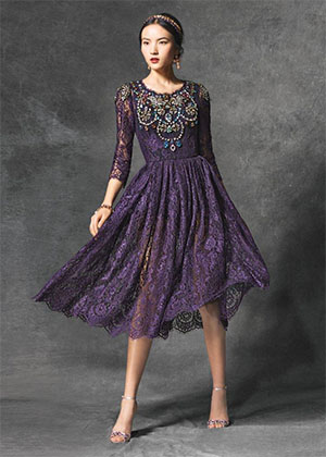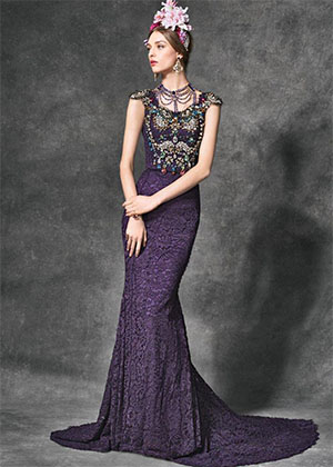 قماش الدانتيل تألق بأبهى الحلل، وبدا في الأجمل مع قصّة الظهر المفتوح، والصدر البنفسجي المزركش بالزخارف الملوّنة الباهرة.