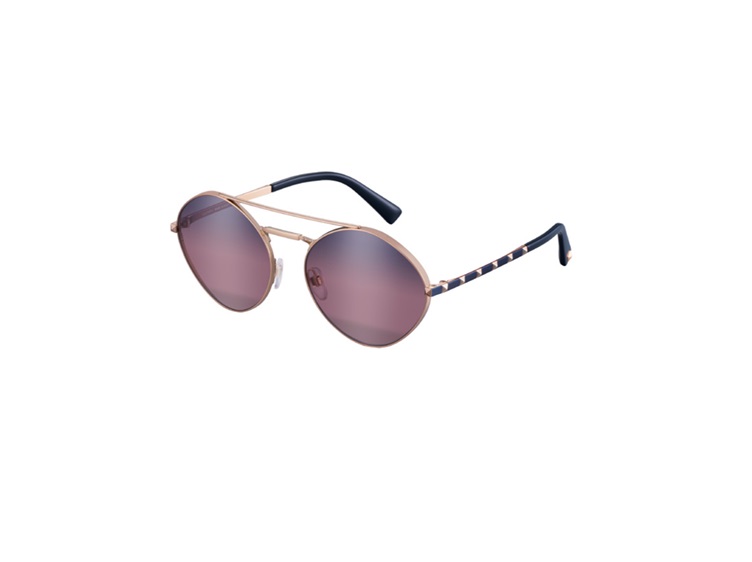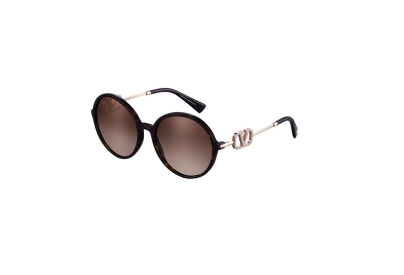 نظارة شمسية مستديرة وكبيرة الحجم، مزوّدة بحلقات مصنوعة من الأسيتات الأسود والعدسات المتدرّجة باللون الأسود أو بلون الهافان يوجد على كل ذراع من الأذرع المصنوعة من المعدن الذهبي توقيع شعار V الجديد الثلاثي الأبعاد مع خط من قطع الكريستال، التي تسهم في أن تصنع من هذا الموديل قطعة أكسسوار خالدة. تحمل نهايات الأذرع المصنوعة من الأسيتات مسمار فالنتينو الأيقوني.