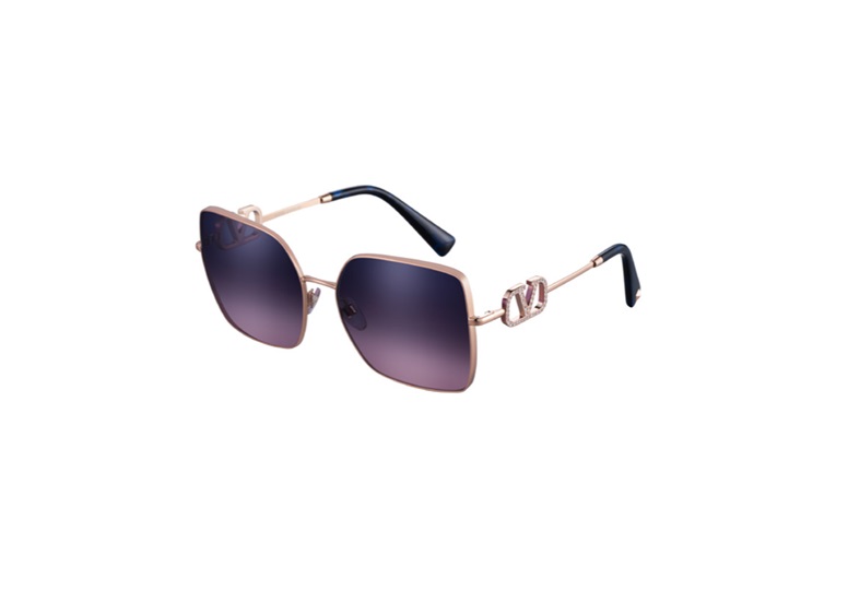 نظارة شمسية عريضة وأنيقة ذات تصميم مربع من المعدن الذهبي. يتمتع الإطار بمظهر مستوحى من الماضي، يزداد ثراؤها بفضل توقيع شعارV المنحوت والمرصّع بقطع الكريستال البرّاقة. يبرز مظهرها الجذاب بفضل العدسات المتدرّجة من اللون الأزرق السماوي إلى اللون الوردي أو اللون البني وكذلك بفضل نهايات الأذرع المتميزة بمسمار فالنتينو الأيقوني.