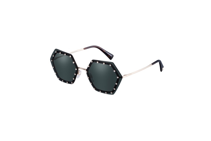 نظارة سداسية مصنوعة من المعدن الذهبي. عدساتها غير منتظمة الشكل ومسطحة ذات الزوايا المستديرة مُثبتة على الإطار بمسامير الكريستال النمساوية، ما يجعله برّاقاً، وتحمل نهايات الأذرع مسمار Valentino الأيقوني.