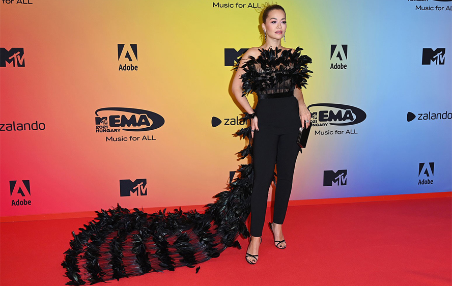 ريتا أورا: من أجل مرورها على السجادة الحمراء، اختارت النجمة البريطانية ريتا أورا من المصمّم اللبناني Jean Louis Sabaji الجامبسوت الأسود في ستايل السروال مع الكورسيه من القماش الشفّاف المزيّن على أطرافه بالريش مع ما يشبه الطرحة المنسدلة من الخلف. إطلالة جميلة وكلاسيكية!