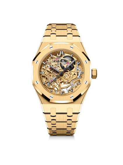 في المقابل، يقدّم إصدار Royal Oak Double Balance Wheel Openworked بقطر 37 ملم رؤية أكثر دفئاً، مع علبة وسوار مصنوعين بالكامل من الذهب الأصفر عيار 18 قيراطاً. يحتضن هذا الإصدار الحركة Calibre 3132 المفرغة، والمزوّدة بآلية العجلتين المتوازنتين التي تعزز الدقة والثبات. ويكشف الغطاء الخلفي المصنوع من الياقوت عن الثقل المتأرجح الذهبي، مكمّلاً تناغم التصميم الأحادي اللون.