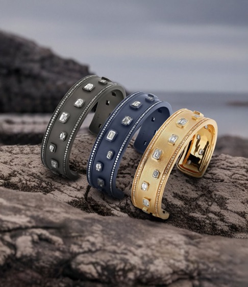 تتجلى الهندسة المعمارية الدقيقة في كل قطعة، حيث يلتقي التيتانيوم الأسود غير اللامع بذهب أصفر مصقول، في حوار جريء بين المواد. يمنح التيتانيوم خفة الوزن والمتانة، بينما تضفي الألماسات الموضوعة بدقة إضاءة معمارية متألقة. تمتاز التصاميم بأسطح نقية ومنحنيات منظمة، تحقق توازناً بين الصلابة والبريق.