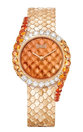 تُطلق بياجيه طرازَين جديدَين من ساعة "لايملايت غالا": ساعةٌ متّقدة مع ميناء باللون البرتقالي الزاهي ومزيّن بالمينا بتقنيّة Grand Feu مع حفر ذهبي لمحاكاة جلد الأفعى ومُحاط بماسات حول العلبة المستديرة تتموّج وتنساب مع الدرجات اللونية الغنيّة الشبهية بغروب الشمس لأحجار عقيق السبيسارتيت على سوار من الذهب المحفور شبيه بجلد الأفعى. تتطلّب تقنية الحفر المتطوّرة هذه والتي تمّ إطلاقها عام 2019 في ساعة "إكستريملي لادي" Extremely Lady مهارةً وخبرةً عالية، وهي تكريم للحرفيّين المتفانين التابعين للدار المتخصّصة في الذهب. فيُشبه التأثير الخادع للبصر والمعزّز للعمق والملمس حراشفَ الأفعى المتعرّجعة والمتموّجة.