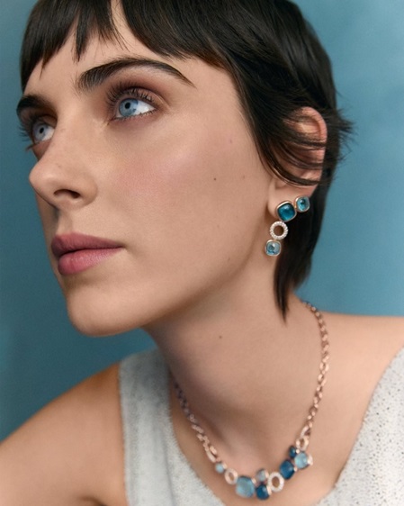 تجمع قلادات نودو "ريفيير" الجديدة، المصنوعة من الذهب الوردي والأبيض، بين نقاء بصمة نودو وبريق قصّة كليسيدرا المتلألئة، حيث تتلاقى باقة نابضة بالحيوية من الأحجار في قلب التصميم. وتتآلف العناصر الهندسية في إيقاع رقيق ومدروس، إذ تلتقي أحجار التوباز الأزرق اللندني والتوباز الأزرق السماوي مع حلقات مرصوفة بالألماس الأبيض ضمن تناغم غير متماثل. يعزّز التصميم الراحة وحرية الحركة، فيما تُكمل سلسلة متحرّكة من الذهب الوردي الجزء الخلفي مع إمكانية تعديلها بما ينسجم بسلاسة مع شكل الجسم. وتعكس الأقراط المنسّقة لوحة الألوان ذاتها، في انسياب متوازن من الضوء واللون. يقدّم طقم ثانٍ توليفة تجمع بين الجمشت الأرجواني والزبرجد الأخضر النقي، حيث يستعرض كل حجر قصّة نودو بأوجهه الـ57 غير المنتظمة، ليبدو كأنّه يطفو داخل حلقات مرصوفة بالألماس الأبيض. ويُوفّر التوزيع غير المتماثل للأحجام المختلفة إحساساً بانسياب الألوان برفق فوق البشرة. تُكمل الأقراط المتطابقة هذا الإحساس، بروح إيطالية تجمع بين التأنّي والعفوية.