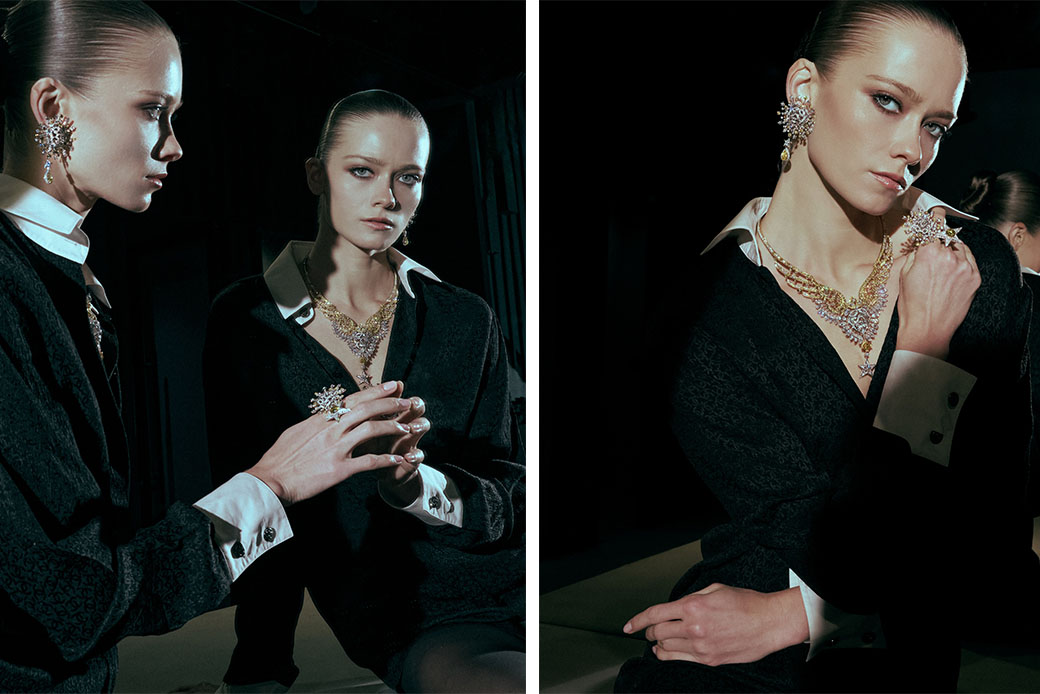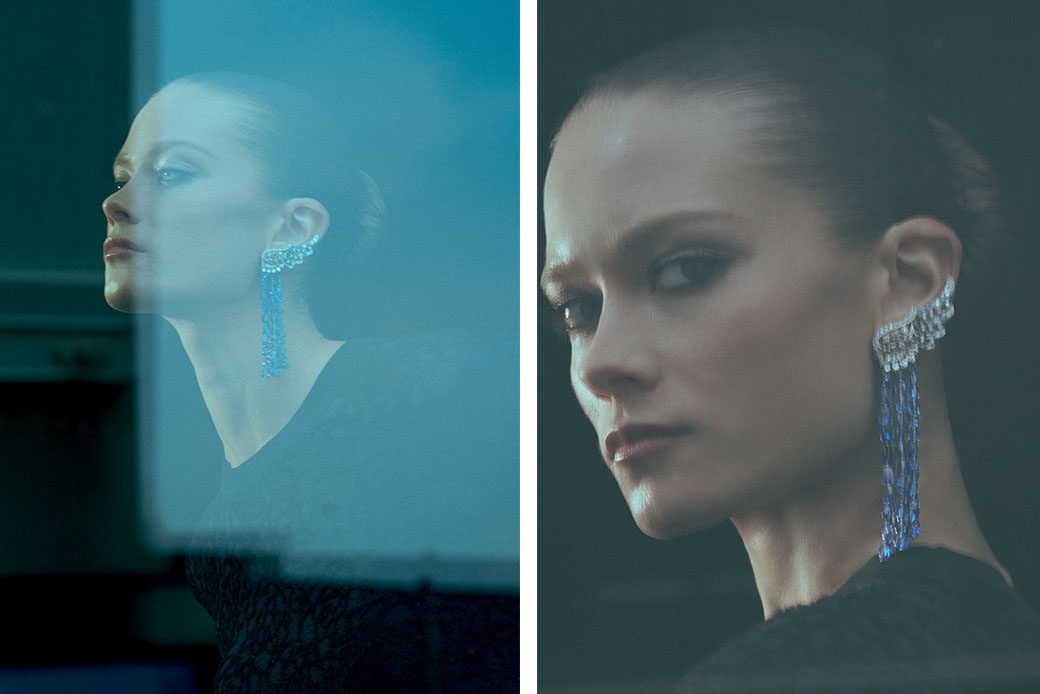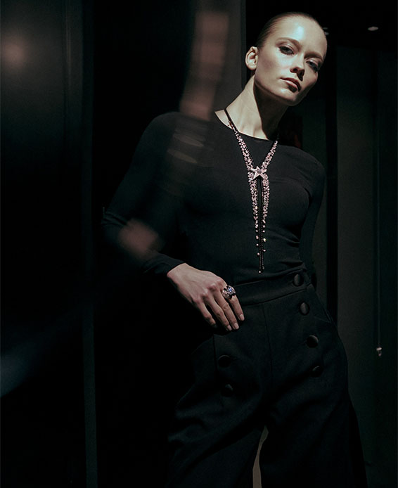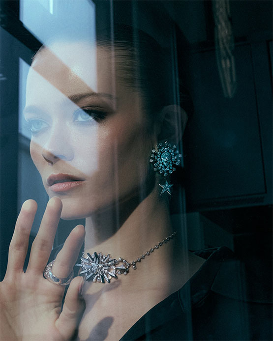 أقراط Be the One من الذهب الأبيض مرصّعة بالألماس، وعقد Dazzling Star من الذهب الأبيض مرصّع بالألماس واللك الأسود، وخاتم Dreams Come True من الذهب الأبيض والذهب المطلي بالأسود مرصّع بالألماس من مجوهرات شانيل الراقية